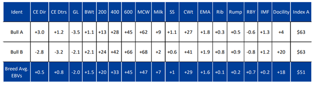 The animals below are a good example of this; while both have an index value of $63, they have very different growth and calving ease attributes.