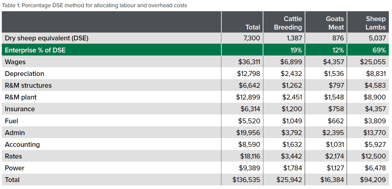 For example, a mixed grazing operation of 3,300 breeding ewes for lamb production, 600 breeding does and 100 breeding cows would have a total carrying capacity of 7,300 DSE. The allocation of labour and overhead costs for this business is demonstrated in Table 1 below.