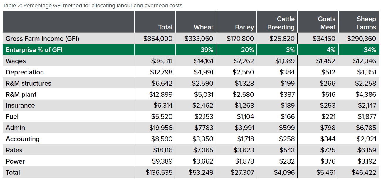 The percentage gross farm income (GFI) method for allocating labour and overhead costs is best used for businesses running two or more activities (for example, cropping and livestock). This method calculates the percentage of total revenue that each enterprise contributes and apportions the total farm labour and overhead costs on this basis.