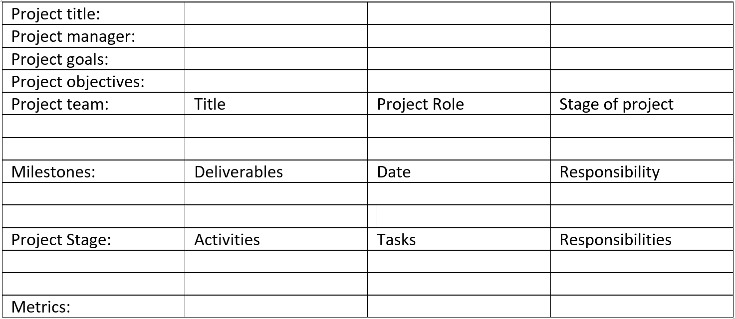 There are many platforms for project management, however if you want to set up your own plan, use this as a guide:
