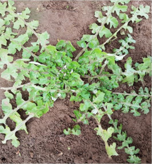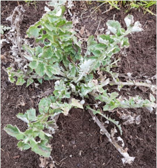 Unsprayed capeweed (left) and sprayed capeweed (middle and right) showing distorted leaves and upright growth.