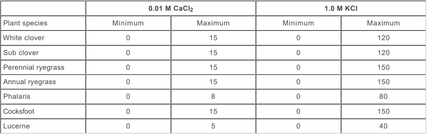 Potassium levels are measured using the Colwell K test, which measures the amount of potassium immediately available to plants and remains relatively stable throughout the year.