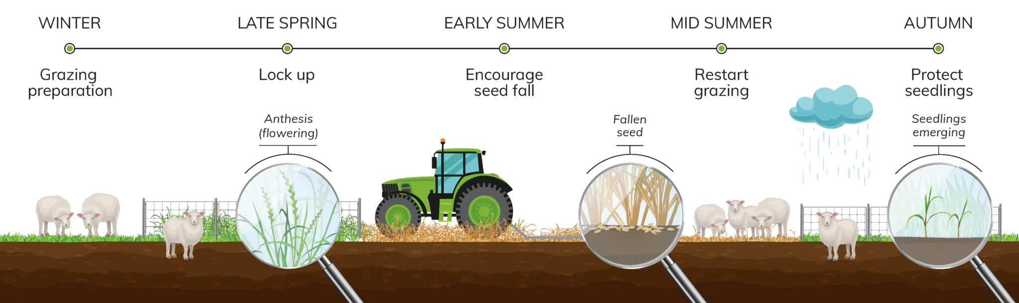 Stock should be excluded for about two months after lock-up or until the seed is ripened, which occurs approximately four weeks after flowering, and has shed from the seed head onto the ground (mid to late January).