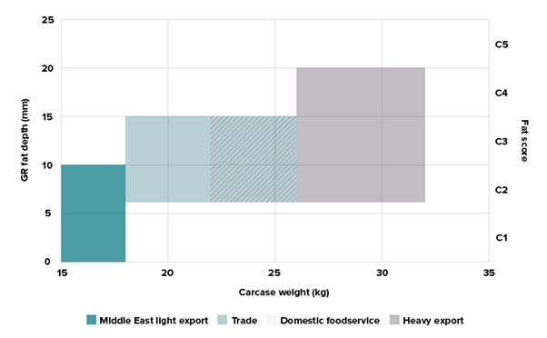 A guide to the range of carcase weight and fat depth specifications for different markets is shown here and the Fat scoring lambs and sheep tool guides producers on how to fat score and assess lambs in the yards.