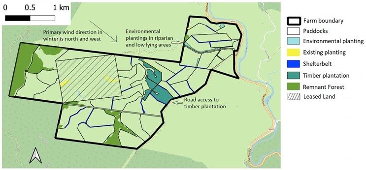 - Shelterbelts around the farm perimeter and on the windward side of future paddocks. Shelterbelts can be wide or narrow. Wider belts might be used around the boundary for privacy or biosecurity, narrower belts for internal paddocks, and when reducing paddock size (e.g., a smaller mob size of ewes will improve lamb survival, most probably due to lower incidence of mismothering.)
