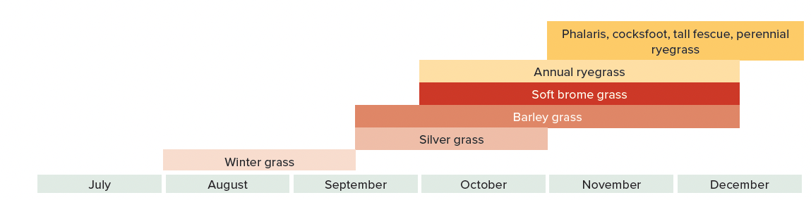 The finish to the season will also affect the dormancy within the seed set. As a general rule, a ‘hard’ finish to a season will result in less dormancy and a ‘soft’ finish will lead to a more staggered level of dormancy in the carryover seed.