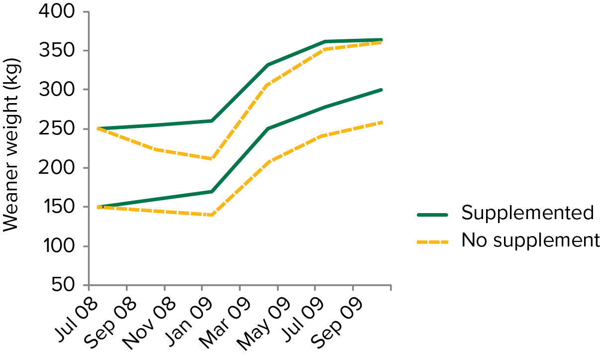 The cost benefits of feeding supplements to weaners depends on supplement prices and the value of the animals. There may be little benefit in supplementing heavy weaners unless their survival is compromised by other events such as sudden cold/wet periods. Other benefits created by good weaning supplementation practices include selling steers earlier and ensuring heifers achieve their critical mating weights at joining. See Figure 3 for an example of achievable weight gains for supplemented and unsupplemented weaners.