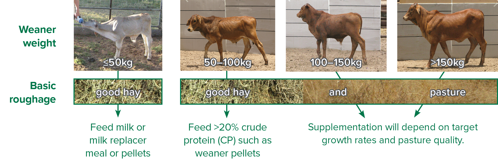 The main challenge for beef enterprises, particularly in northern Australia, arises when calves are weaned during a period of declining feed quality. Supplementation programs can be designed for weaners of various weight ranges on a low or declining level of nutrition as shown below.