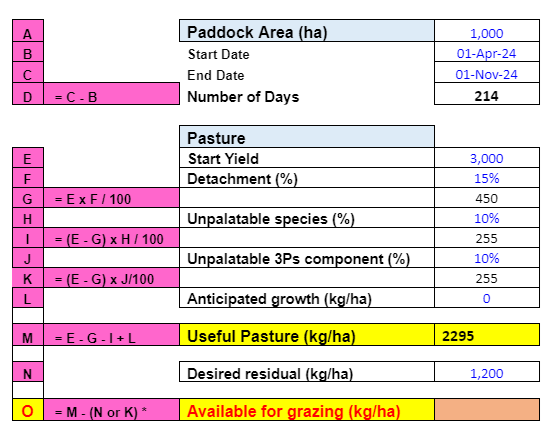 Using the following table calculate Jack’s total amount of pasture, in kg DM/Ha, available for grazing after the desired residual is left?