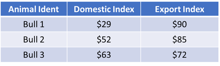 You are producing cattle for the domestic supermarket trade. Consider the selection indexes of the following bulls. Which bull is most profitable for your production system?
